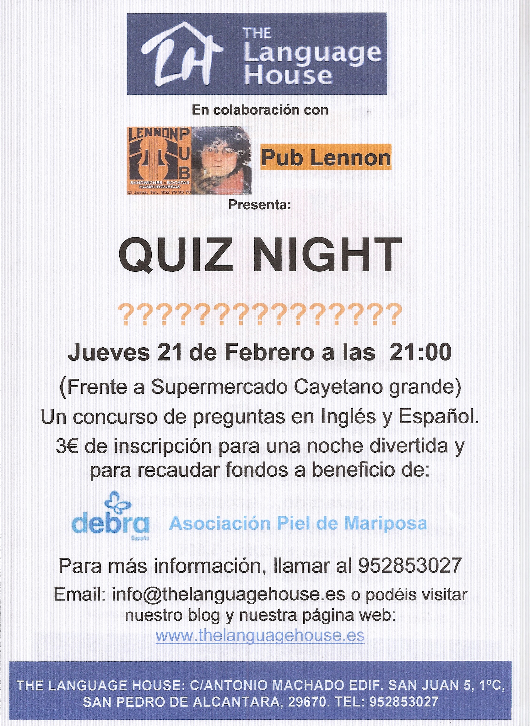 Jueves, día 21 de febrero de 2013, a las 21:00 en el Pub Lennon, San Pedro de Alcántara, disfrutamos de un concurso de preguntas y respuestas en inglés y español en equipos. El concurso consistió en responder correctamente a una variedad de preguntas en rondas y en intentar puntuar más que los otros equipos, algo como el ‘Trivial’ pero aún más divertido!